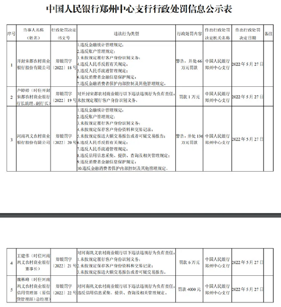 6月7日消息,央行郑州中心支行更新的行政处罚公告显示,河南巩义农村商业银行因存在10项违法违规行为被央行郑州中心支行处以警告并罚款136万元,相关责任人王建伟(时任河南巩义农村商业银行董事长),对下述违法违规行为中第3、4、5项负有责任,被罚款6万元。相关责任人魏林峰(时任河南巩义农村商业银行信用管理部总经理),对下述违法违规行为中第8项负有责任,被罚款4000元。