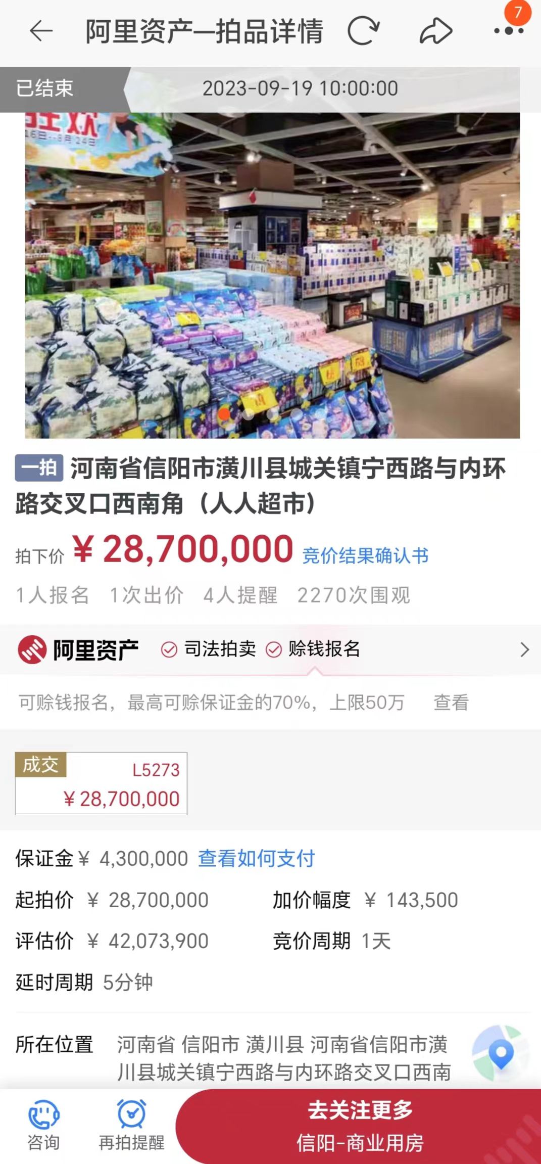 2023年8月18日,潢川县人民法院通过淘宝网司法拍卖网络平台上进行第一次公开拍卖活动,最终以2870万元的价格成交,确认拍成。