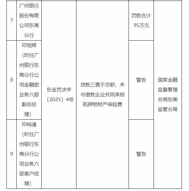 广州银行东莞分行被罚95万 贷款三查不尽职等