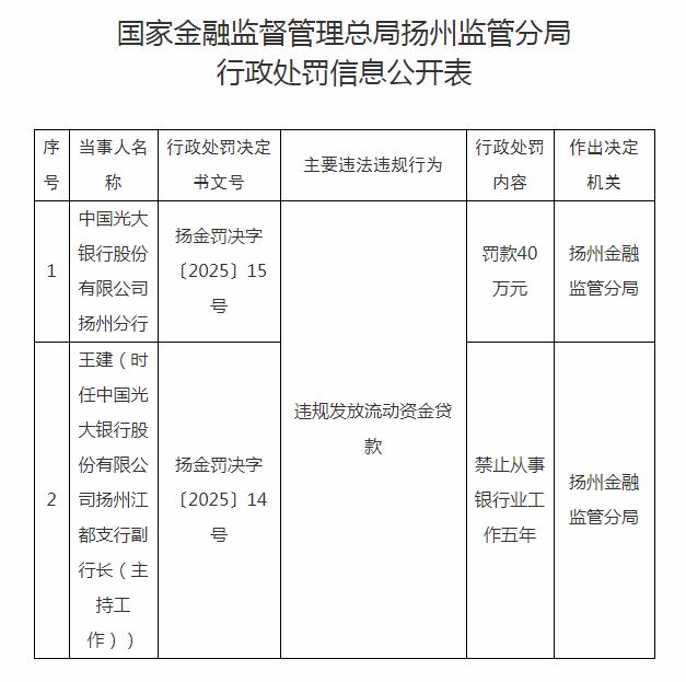 台海网3月29日讯 根据国家金融监督管理总局网站近日发布的行政处罚信息公开表(扬金罚决字〔2025〕14号、15号)显示,因违规发放流动资金贷款,国家金融监督管理总局扬州金融监管分局对中国光大银行股份有限公司扬州分行罚款40万元;王建(时任中国光大银行股份有限公司扬州江都支行副行长(主持工作))禁止从事银行业工作五年。