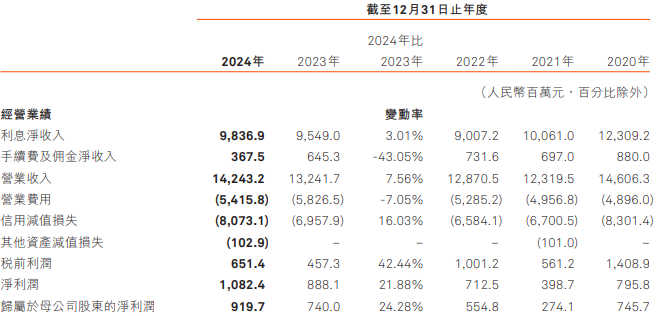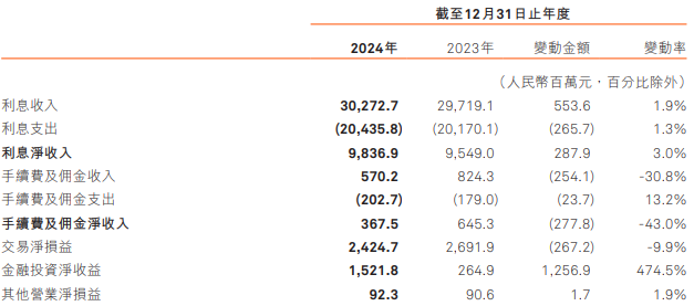 其中,利息收入302.73亿元,同比增加5.54亿元,增幅1.9%,利息收入的增加主要由于整体生息资产的平均结余从上年的6,672.91亿元增加至2024年的7,493.06亿元,而部分被平均收益率从上年的4.45%下降至2024年的4.04%抵销所致。