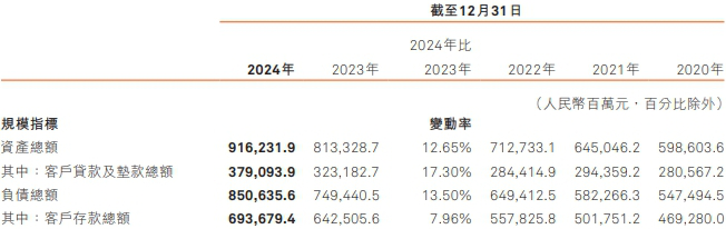 截至2024年末,集团资产总额9,162.32亿元,较上年末增长12.65%;贷款余额3,790.94亿元,较上年末增长17.30%;负债总额8,506.36亿元,较上年末增长13.50%;存款余额6,936.79亿元,较上年末增长7.96%。