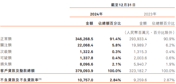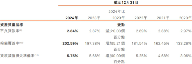 截至2024年12月31日,集团不良贷款余额为107.57亿元,上年末为92.60亿元;不良贷款率为2.84%,较上年末下降0.03个百分点;拨备覆盖率202.59%,较上年末上升5.21个百分点;贷款减值损失准备率为5.75%,较上年末上升0.09个百分点。