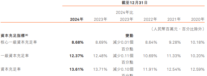 截至2024年12月31日,哈尔滨银行核心一级资本充足率、一级资本充足率、资本充足率分别为8.68%、12.37%、13.61%,较上年末分别下降0.01个百分点、0.11个百分点、0.10个百分点。核心一级资本充足率、一级资本充足率、资本充足率下降的主要原因是风险加权资产增加所致。