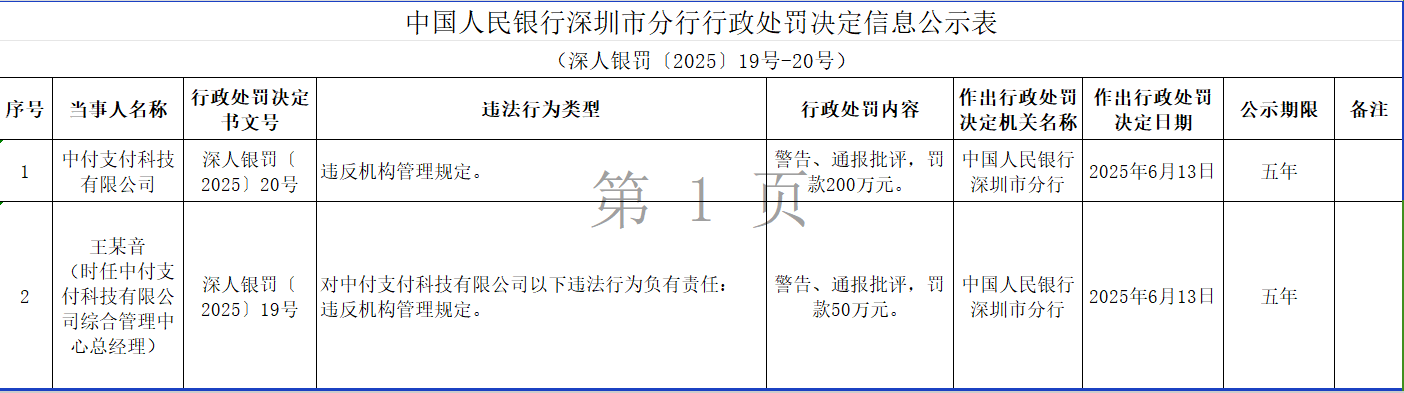 中国经济网北京6月24日讯 中国人民银行网站近日更新的中国人民银行深圳市分行行政处罚决定信息公示表(深人银罚〔2025〕19号-20号)显示,中付支付科技有限公司违反机构管理规定。中国人民银行深圳市分行对其警告、通报批评,罚款200万元。