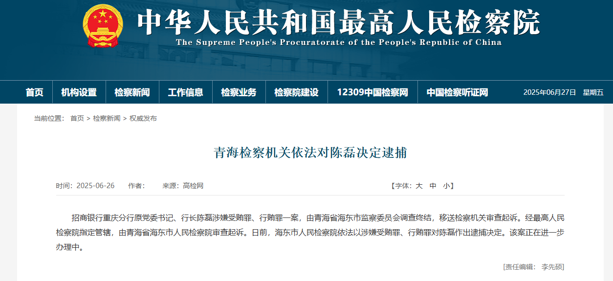 中国经济网北京6月27日讯 高检网26日发布消息“青海检察机关依法对陈磊决定逮捕”。招商银行重庆分行原党委书记、行长陈磊涉嫌受贿罪、行贿罪一案,由青海省海东市监察委员会调查终结,移送检察机关审查起诉。经最高人民检察院指定管辖,由青海省海东市人民检察院审查起诉。日前,海东市人民检察院依法以涉嫌受贿罪、行贿罪对陈磊作出逮捕决定。该案正在进一步办理中。