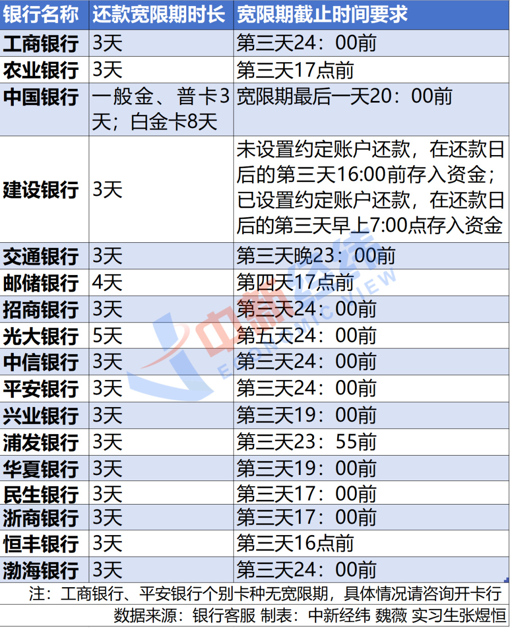 中新经纬梳理发现,除了个别特殊卡种外,目前其他17家银行均为信用卡客户提供了3至5天不等的宽限期,无需客户自己申请。