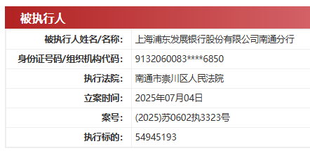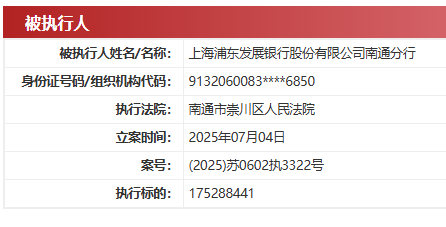 中国执行信息公开网显示,上海浦东发展银行股份有限公司南通分行7月4日新增2条被执行人,执行法院为南通市崇川区人民法院,执行案号分别为(2025)苏0602执3322号、(2025)苏0602执3323号,执行标的分别为17528.84万元与5494.52万元。