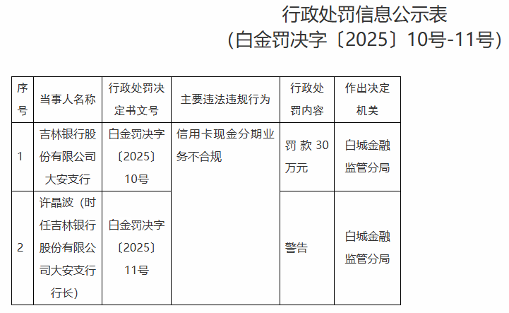吉林银行大安支行违规被罚 信用卡现金分期业务不合规