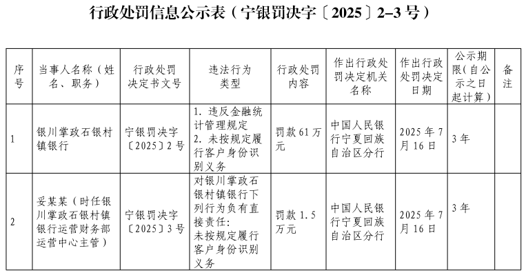 中国经济网北京7月24日讯 中国人民银行宁夏回族自治区分行网站昨日公布行政处罚信息公示表(宁银罚决字〔2025〕2-3号)。银川掌政石银村镇银行违反金融统计管理规定;未按规定履行客户身份识别义务。中国人民银行宁夏回族自治区分行对该行罚款61万元。