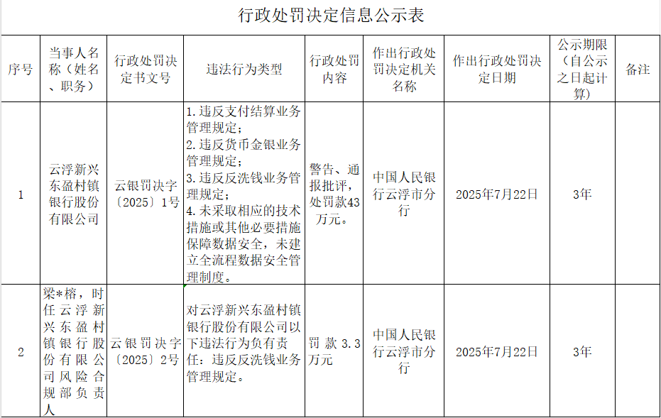 中国经济网北京7月30日讯 央行网站昨日公布的中国人民银行云浮市分行行政处罚决定信息公示表(云银罚决字〔2025〕1号-2号)显示,云浮新兴东盈村镇银行股份有限公司违反支付结算业务管理规定;违反货币金银业务管理规定;违反反洗钱业务管理规定;未采取相应的技术措施或其他必要措施保障数据安全,未建立全流程数据安全管理制度。中国人民银行云浮市分行对其警告、通报批评,处罚款43万元。