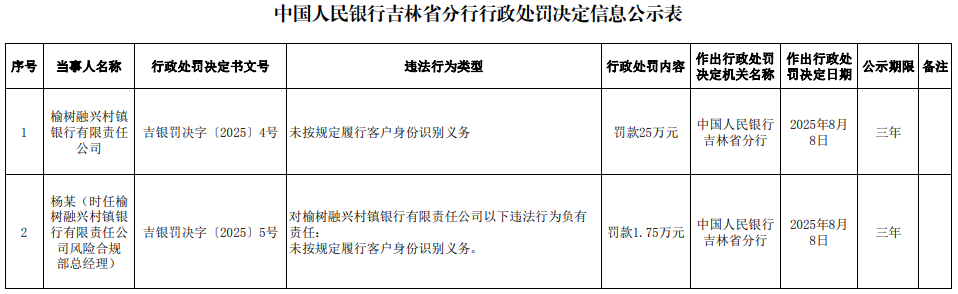 中国经济网北京8月12日讯 中国人民银行吉林省分行网站近日公布的行政处罚决定信息公示表(吉银罚决字〔2025〕4号-5号)显示,榆树融兴村镇银行有限责任公司未按规定履行客户身份识别义务。中国人民银行吉林省分行对其罚款25万元。