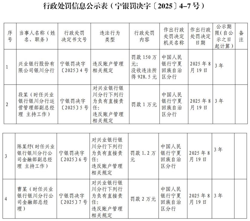 中国经济网北京9月9日讯 中国人民银行宁夏回族自治区分行昨日公布的行政处罚信息公示表(宁银罚决字﹝2025﹞4-7号)显示,兴业银行股份有限公司银川分行违反账户管理相关规定,中国人民银行宁夏回族自治区分行对其罚款150万元;没收违法所得928.5元。
