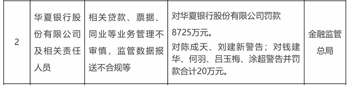 近日,国家金融监督管理总局官网显示,华夏银行因存在相关贷款、票据、同业等业务管理不审慎,监管数据报送不合规等违法违规行为,被处以罚款8725万元。同时两名责任人被警告,四名责任人被警告并处以罚款。
