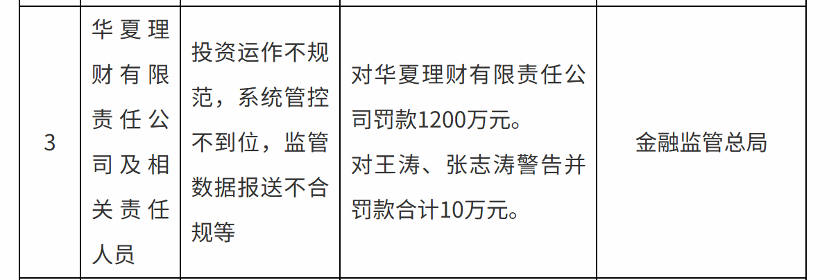 9月12日,金融监管总局行政处罚信息公开表显示,华夏理财因投资运作不规范,系统管控不到位,监管数据报送不合规等被罚款1200万元。