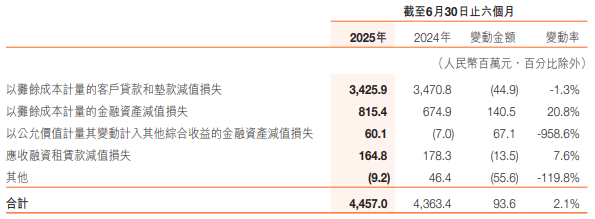 2025年上半年,哈尔滨银行信用减值损失为44.57亿元,同比增长2.1%。其中,以摊余成本计量的客户贷款和垫款减值损失34.26亿元,同比减少1.3%。
