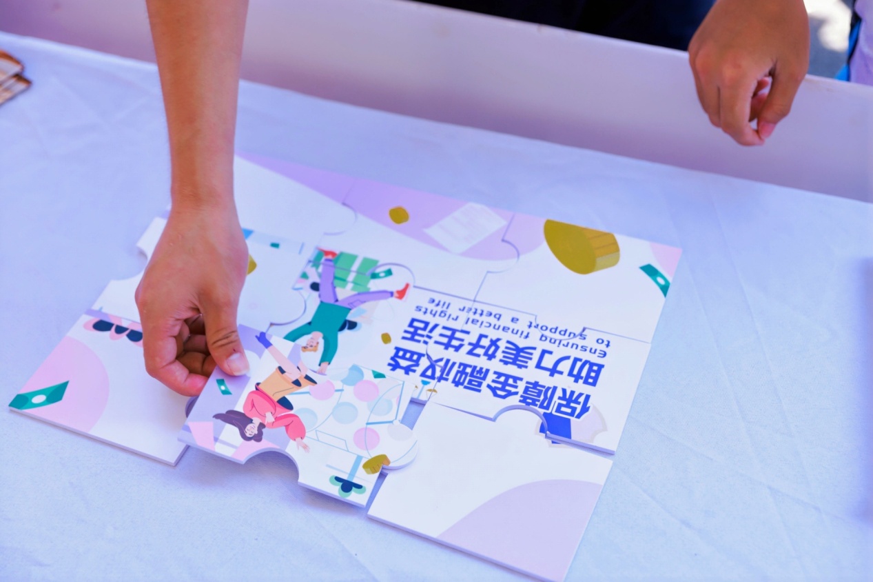 为提升参与度和传播效果,本次活动还融入了多项互动环节。“消保拼拼乐”游戏中,同学们通过拼接金融知识拼图,在娱乐中学习金融消费者的八项基本权利;丢沙包游戏则将金融知识问答与趣味游戏相结合,答对者可获赠精美礼品,现场气氛热烈,欢声笑语不断;“消保知识快问快答”更是将活动推向了高潮,同学们踊跃参与,积极抢答,充分展现对金融知识的掌握程度与应用能力。
