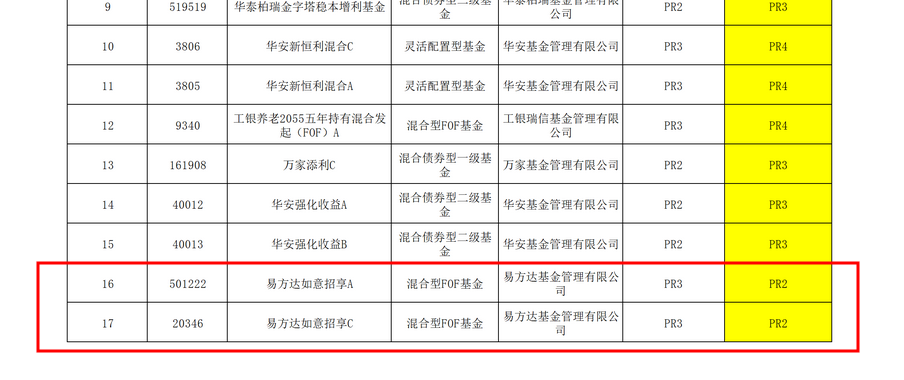 财联社记者查询发现,本次中信银行调整的产品共有17只,其中下调风险评级的有两只,为易方达管理的混合型FOF基金,均从PR3下调至PR2。其余基金均为风险评级上升。