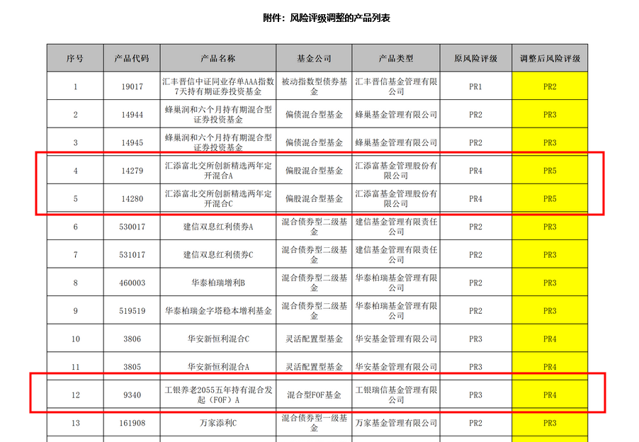 其中,汇添富基金的两款北交所主题的偏股混合型基金从PR4上调至PR5(最高风险等级)。并且,颇为罕见的是,中信银行本次还将工银瑞信基金的一款养老主题产品“工银养老2055五年持有混合发起(FOF)A”的风险评级从PR3上调至PR4。