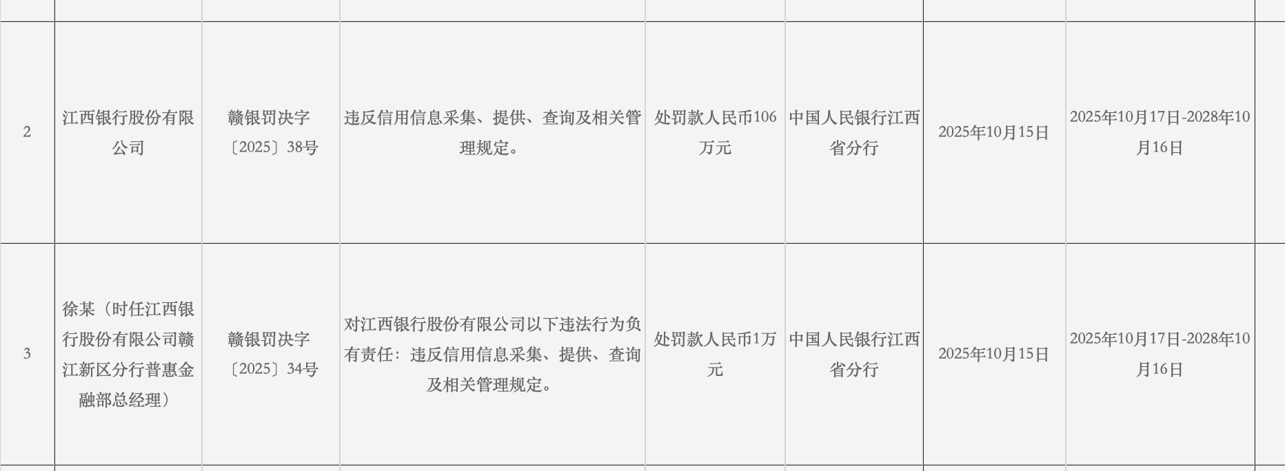 上证报中国证券网讯(记者徐潇潇)10月20日,记者获悉,中国人民银行网站近日公布的江西省分行行政处罚信息公示表显示,江西银行违反信用信息采集、提供、查询及相关管理规定。