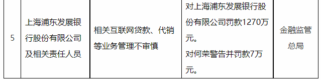 浦发银行被罚1270万 相关互联网贷款等业务管理不审慎