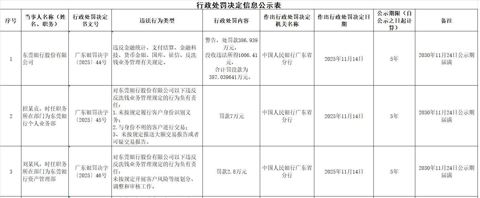 广东银罚决字〔2025〕44号显示,东莞银行股份有限公司违反金融统计、支付结算、金融科技、货币金银、国库、征信、反洗钱业务管理有关规定。中国人民银行广东省分行对其警告,处罚款386.939万元,没收违法所得1006.41元,合计罚没款为387.039641万元。