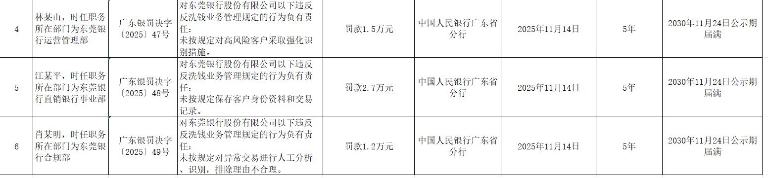 广东银罚决字〔2025〕49号显示,肖某明(时任职务所在部门为东莞银行合规部)被罚款1.2万元。