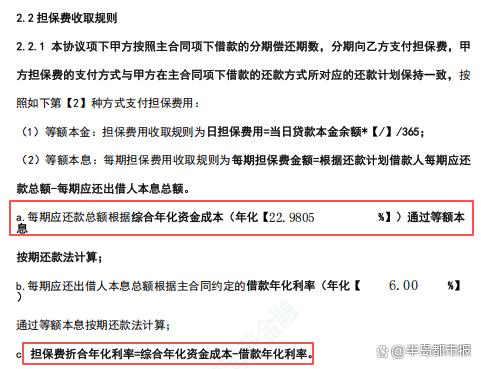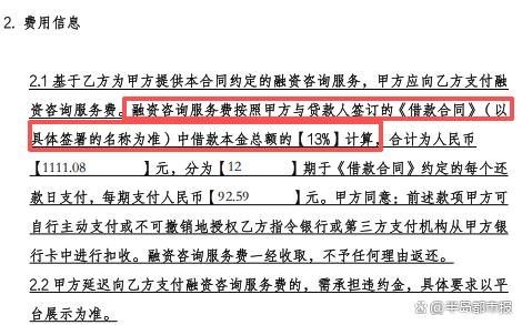 黄先生提供的借款协议显示,除了利息外,黄先生还需支付1392.08元的担保费,以及1111.08元的融资咨询服务费。协议中明确提到,担保费折合年化利率的计费方式为:综合年化资金成本(22.9805%)-借款年化利率(6%),而融资咨询服务费则按借款本金总额的13%计算,二者皆由哈密市嘉合兴融资担保有限公司收取。