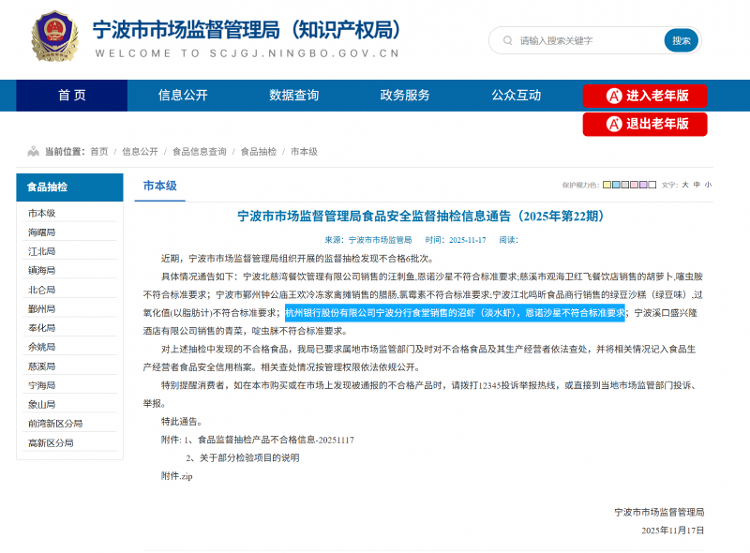 日前,宁波市市场监督管理局披露2025年第22期食品安全监督抽检信息,其中杭州银行宁波分行食堂销售的沼虾(淡水虾),存在恩诺沙星残留超标的情况。