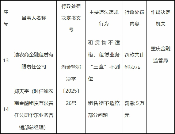 郑天宇(时任渝农商金融租赁有限责任公司华东业务营销部总经理)对租赁物不适格部分问题负有责任,重庆金融监管局对其罚款5万元。
