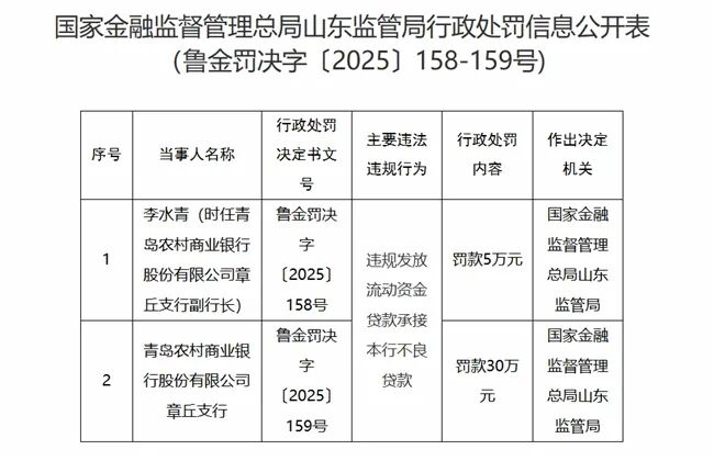 12月31日,国家金融监管总局山东监管局发布的行政处罚信息显示,青岛农村商业银行股份有限公司(以下简称“青农商行”)章丘支行因违规发放流动资金贷款承接本行不良贷款而被罚款30万元。时任青农商行章丘支行副行长李水青被罚款5万元。
