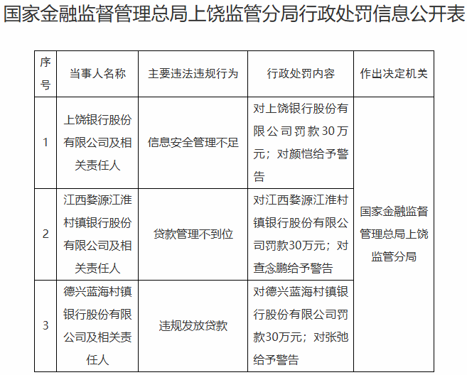 国家金融监督管理总局上饶监管分局对德兴蓝海村镇银行股份有限公司罚款30万元;对张弛给予警告。