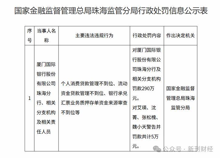2026年1月12日,厦门国际银行收到了来自国家金融监督管理总局上海监管局的罚单——上海闸北支行和虹桥支行总共被罚120万元,2名时任行长受到处分。