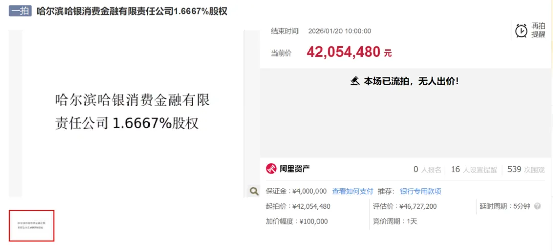 1月20日,阿里资产网站显示,哈银消费金融1.6667%股权,在开拍24小时后,因无人出价而流拍。