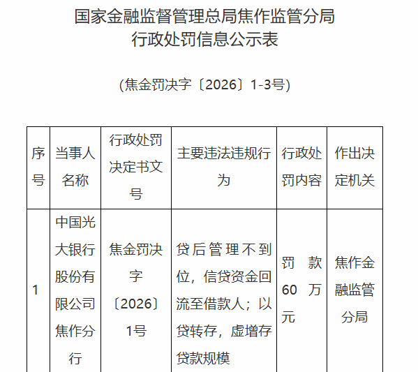 中国光大银行股份有限公司(简称“光大银行”,601818.SH)焦作分行存在以下违法违规事实:贷后管理不到位,信贷资金回流至借款人;以贷转存,虚增存贷款规模。焦作金融监管分局决定对其处以罚款60万元。