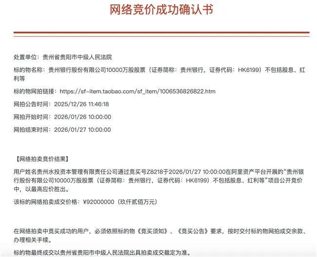 1月27日,贵州银行(HK06199)1亿股股权在阿里司法拍卖平台首拍成交,唯一报名方贵州水投资本管理有限责任公司(以下简称“贵州水投资本”)以起拍价9200万元竞得。