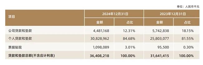 贷款结构中,华瑞银行的个人贷款占比较高。2024年末,该行个人贷款余额为308.29亿元,占贷款和垫款总额比重为84.68%;公司贷款余额为44.81亿元,占贷款和垫款总额比重为12.31%。