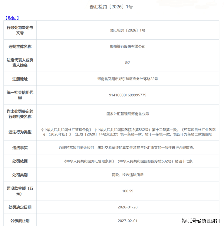 郑州银行的合规风险也接踵而至。2026年1月28日,因“办理经常项目资金收付未审查交易单证真实性”,该行被外汇管理局罚款100.59万元。