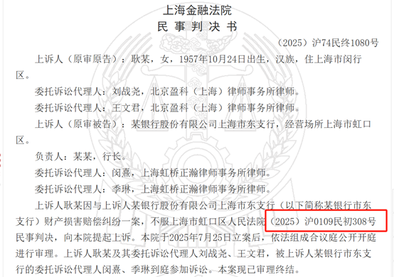 本案目前已审理终结,二审判决书显示,一审判决书为上海市虹口区人民法院(2025)沪0109民初308号民事判决。根据天眼查进一步查询,耿某与中国光大银行股份有限公司上海市东支行相关财产损害赔偿纠纷一案的案号与上述相同,被告即光大银行上海市东支行。
