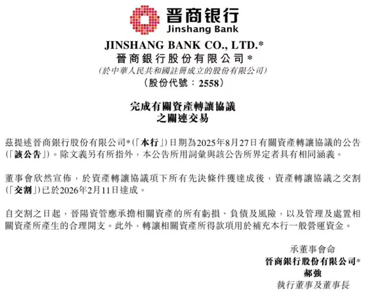 公告内容显示,晋阳资管在首期支付9310万元(占总对价的30%)后,获得相应资产的所有权益。而根据晋商银行目前公告,这笔交易已于2026年2月11日完成交割。