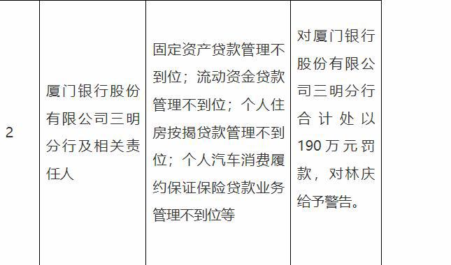 3月16日,国家金融监督管理总局三明监管分局发布行政处罚信息,厦门银行股份有限公司三明分行因存在“固定资产贷款管理不到位、流动资金贷款管理不到位、个人住房按揭贷款管理不到位、个人汽车消费履约保证保险贷款业务管理不到位”等多项违法违规行为,被合计处以190万元罚款;相关责任人林庆被给予警告。