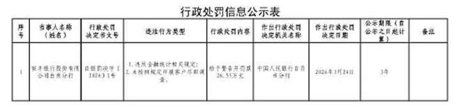 3月25日,中国人民银行自贡市分行行政处罚信息公示表显示,恒丰银行股份有限公司自贡分行因违反金融统计相关规定、未按照规定开展客户尽职调查,被给予警告并处罚款26.55万元。