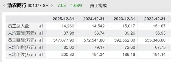 记者注意到,近年来重庆农商行的在岗员工数量呈缩减态势。Wind数据显示:2022年至2024年,该行在岗员工数分别为15167人、15017人、14542人,2025年进一步下降至14266人,较上年减少了276人。