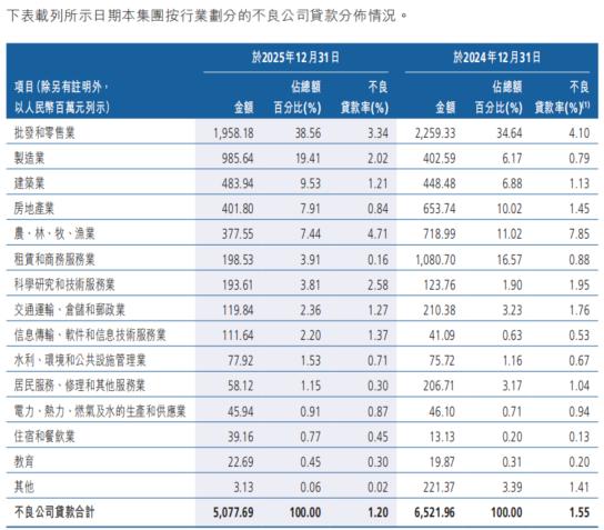 2023年至2025年,该行连续3年甩卖百亿级信贷资产,其中绝大多数为房地产相关不良资产。财报显示,该行房地产行业不良率从2023年末的5.94%大幅降至2025年末的0.84%,不良贷款额从31.57亿元骤降至4.02亿元。公司贷款整体不良率也从2020年末的2.31%降至1.20%,踩中恒大地产、鸿达兴业集团等多个“雷点”后的大幅压降,显示出管理层化解历史包袱的决心。