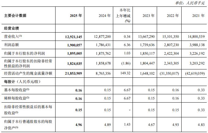 从全年数据来看,郑州银行交出了一份看似稳健的成绩单。截至2025年末,该行资产总额达到7436.74亿元,较上年末增长9.95%,增速创2018年以来新高,显示出较强的规模扩张能力。在盈利能力方面,全年实现营业收入129.21亿元,同比增长0.34%;归母净利润18.95亿元,同比增长1.03%。