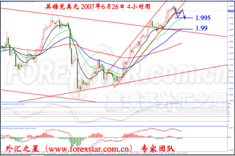 短线上今日在1.99一线具有较好支撑。目前4小时图中MACD张口状态仍为向下,因此日内短线整体上依旧保持短线调整的走势节奏,但不会改变短线上涨的格局。
