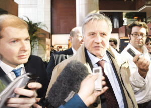 中国人民银行行长周小川昨日会见了应邀来访的欧元集团主席、卢森堡首相兼财政大臣容克、欧洲中央银行行长特里谢和欧盟委员会经济与货币事务委员阿尔穆尼亚一行。双方认为,应共同努力,采取综合性措施,加大经济结构调整力度,防止汇率大幅波动,为全球失衡有序调整做出应有贡献。图为特里谢在北京接受记者采访。