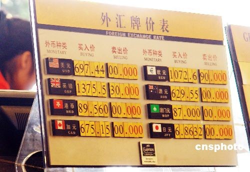 2008年3月27日消息,伴随国际汇市美元结束反弹,人民币对美元汇率出现一波快速走高过程。来自中国外汇交易中心的最新数据显示,27日人民币对美元汇率中间价在前一交易日升破7.03的基础上再破7.02,以7.0130创出汇改以来新高,单日升值122个基点。短期内突破7.00元整数关口的可能性较大。图为郑州市一家酒店的美元买入价已标到了697.44元。中新社发马健摄