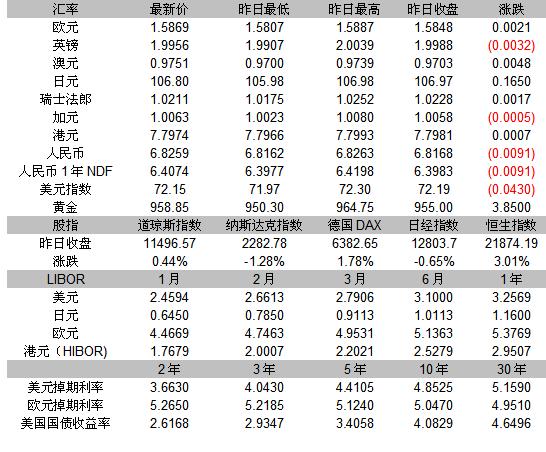 外汇市场上,美元兑欧元录得一个月来最大单周涨幅,尾盘美元指数上升0.2%,报72.191;欧元兑美元小跌0.1%,报1.5841;美元兑日圆上扬0.7%,报106.94;英镑兑美元下滑0.2%,报1.9973。