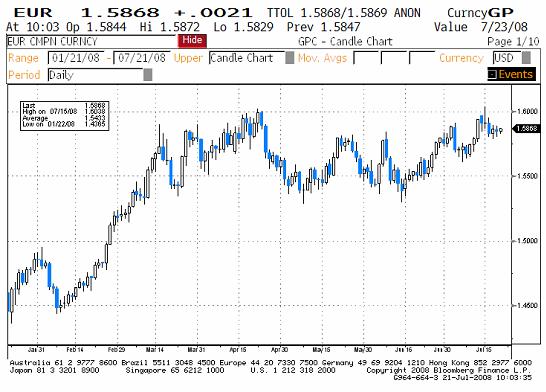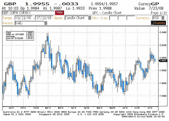 经济数据方面,德国6月份生产者物价指数年率6.7%,高于预估值6.5%,前值为6.0%。尽管欧央行行长Trichet表示欧盟区内经济增长面临下行风险,在第2、3季度见底,但通胀数据意味短期内欧洲央行不轻易降息,这对欧元带来一点支撑。
